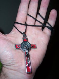 Around my neck I now wear a big, heavy, Saint Benedict crucifix alongside my silver cross. I bought it in memory of my stay amongst the monks and it’s weight reminds me of things. I had it blessed by the abbot. I have heretical thoughts about it at night before I go to sleep. I imagine that while I am sleeping the figure of Christ climbs off the cross and wanders my room looking for escape. It really is ridiculous.