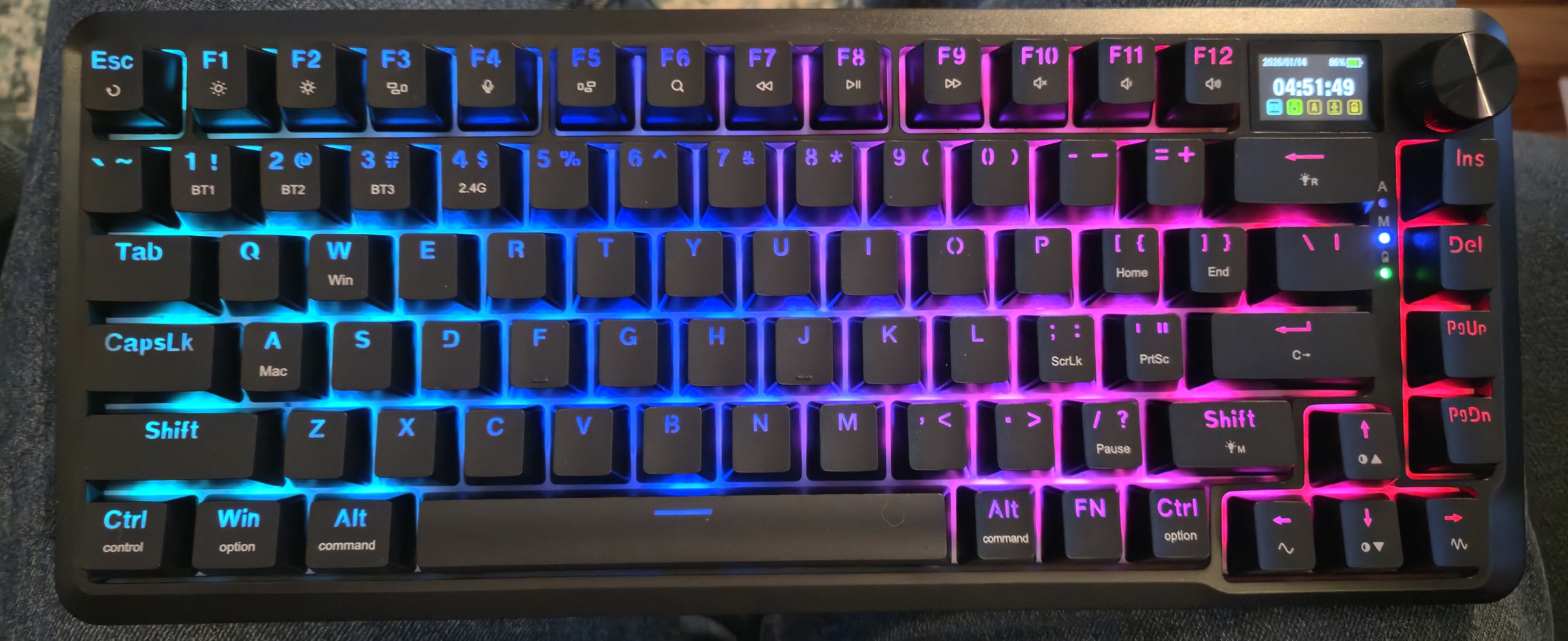 The keyboard has a nice weight to it which makes it feel more quality for some reason. The same programmable backlighting. This keyboard is a 75% compared to the old 65% which is also nice. The new keyboard includes a programmable dial and screen as well for additional functionality.